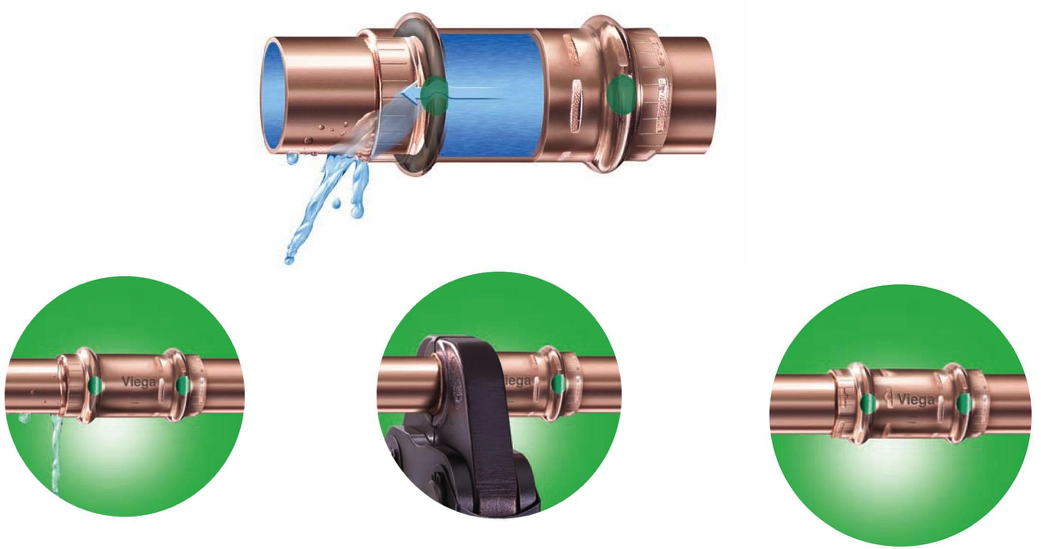Viega única marca en poseer la característica exclusiva Smart Connect™: Si un punto no está prensado, se puede detectar inmediatamente y de manera visual que existe una fuga en ese punto no prensado, al hacer prueba de 0.5 a 45psi de aire o de 15 a 85psi con agua.